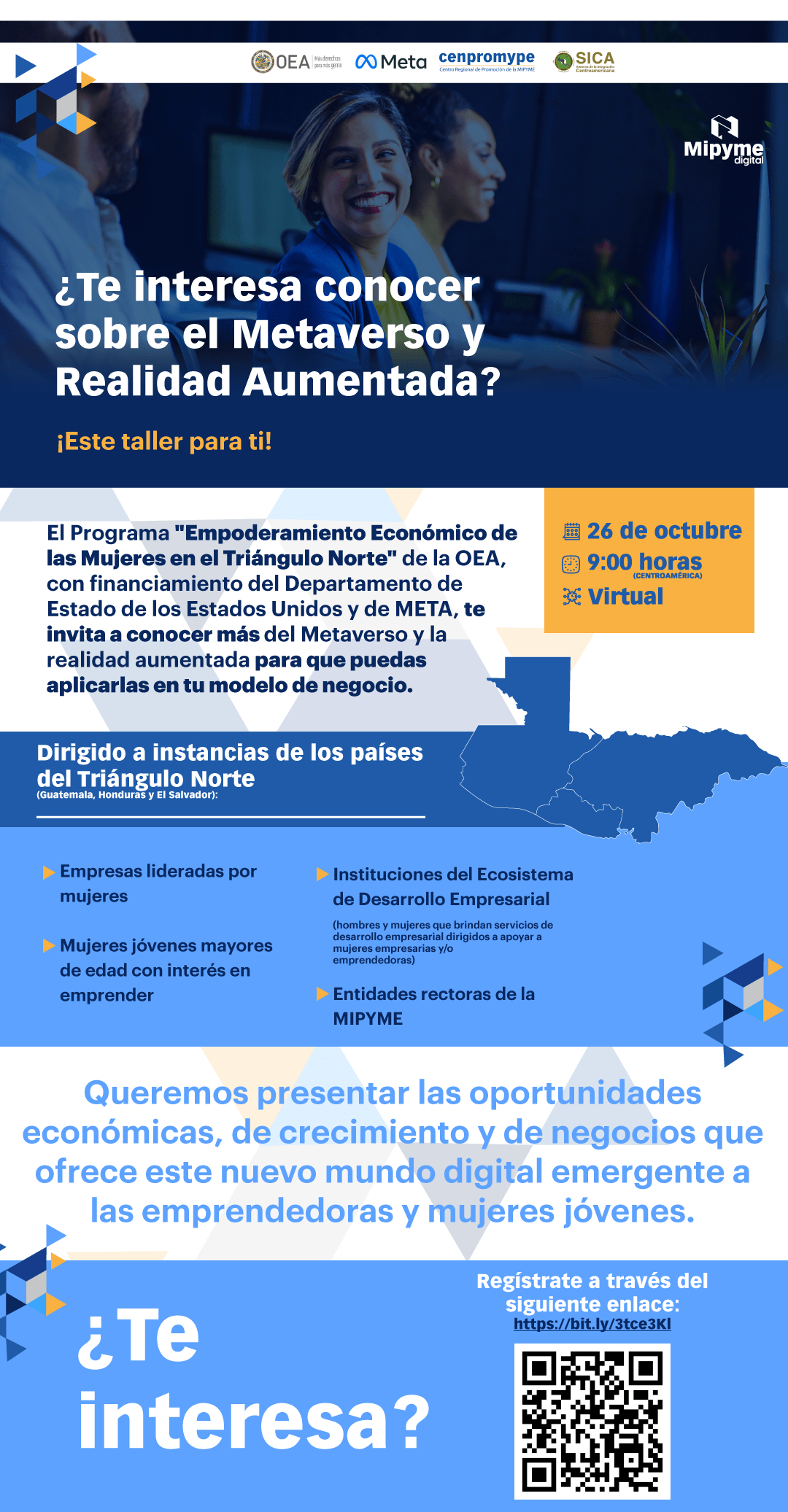El Programa «Empoderamiento Económico de las Mujeres en el Triángulo Norte» de la OEA, con financiamiento del Departamento de Estado de los Estados Unidos y de META, te invita a conocer más del Metaverso y la realidad aumentada para que puedas aplicarlas en tu modelo de negocio.